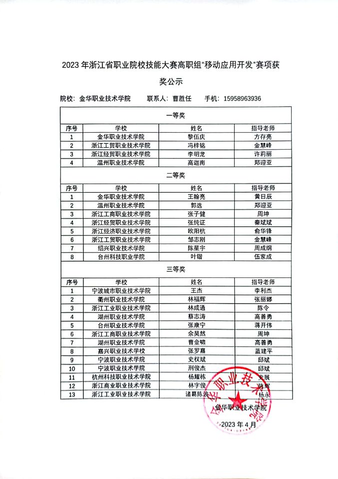 2023年浙江省职业院校技能大赛(高职)“移动应用开发”赛项于在金华职业技术学院成功举办,现将承办校报送的一、二、三等奖获奖选手、指导老师及所在学校名单予以公示。