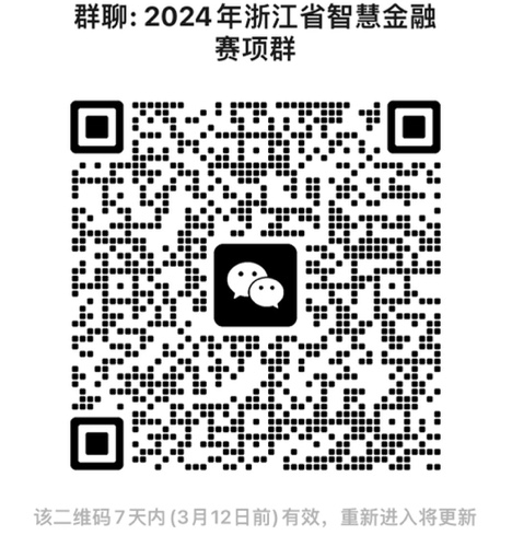 5.各参赛院校领队、参赛教师请加入微信群,相关信息都会在群里发布。进群后请按照学校+姓名格式改名,请及时关注群通知。如微信群二维码失效,请各院校相关教师添加台州科技职业学院林别雨老师入群,联系电话:139-5859-2789(微信同号,申请好友请标注:智慧金融赛项+学校+姓名)。