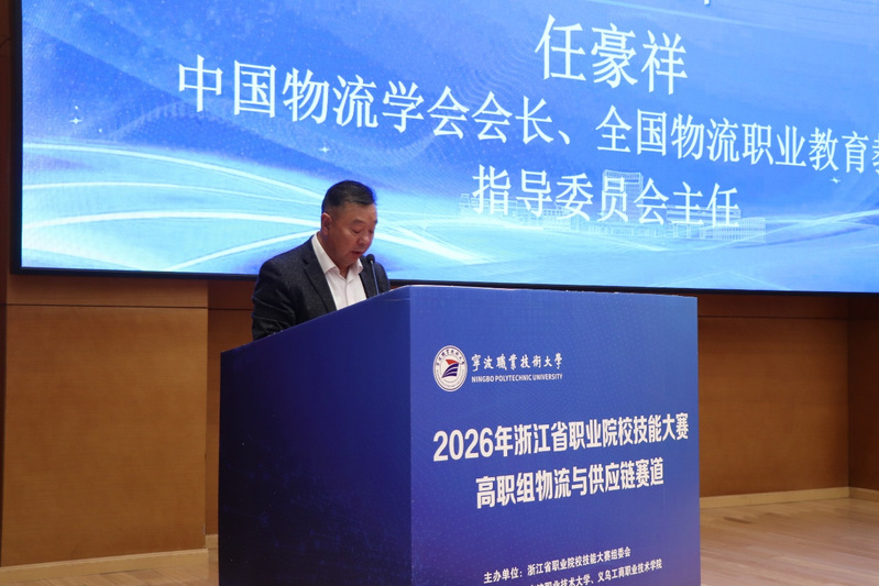 任豪祥会长在致辞中对大赛开幕表示祝贺,高度肯定我校依托宁波港口区位优势深耕物流人才培养的办学特色与成果。他指出,今年是“十五五”开局之年,物流与供应链产业迎来高质量发展新机遇,教育部相关政策为物流职业教育改革指明方向。本次赛道作为世界职业院校技能大赛对应赛项,贴合行业岗位需求,突出技能创新与综合育人,是检验浙江物流职业教育成果、促进人才交流提升的优质平台,希望各方协同保障大赛圆满举办。